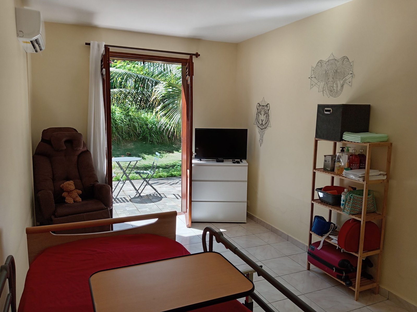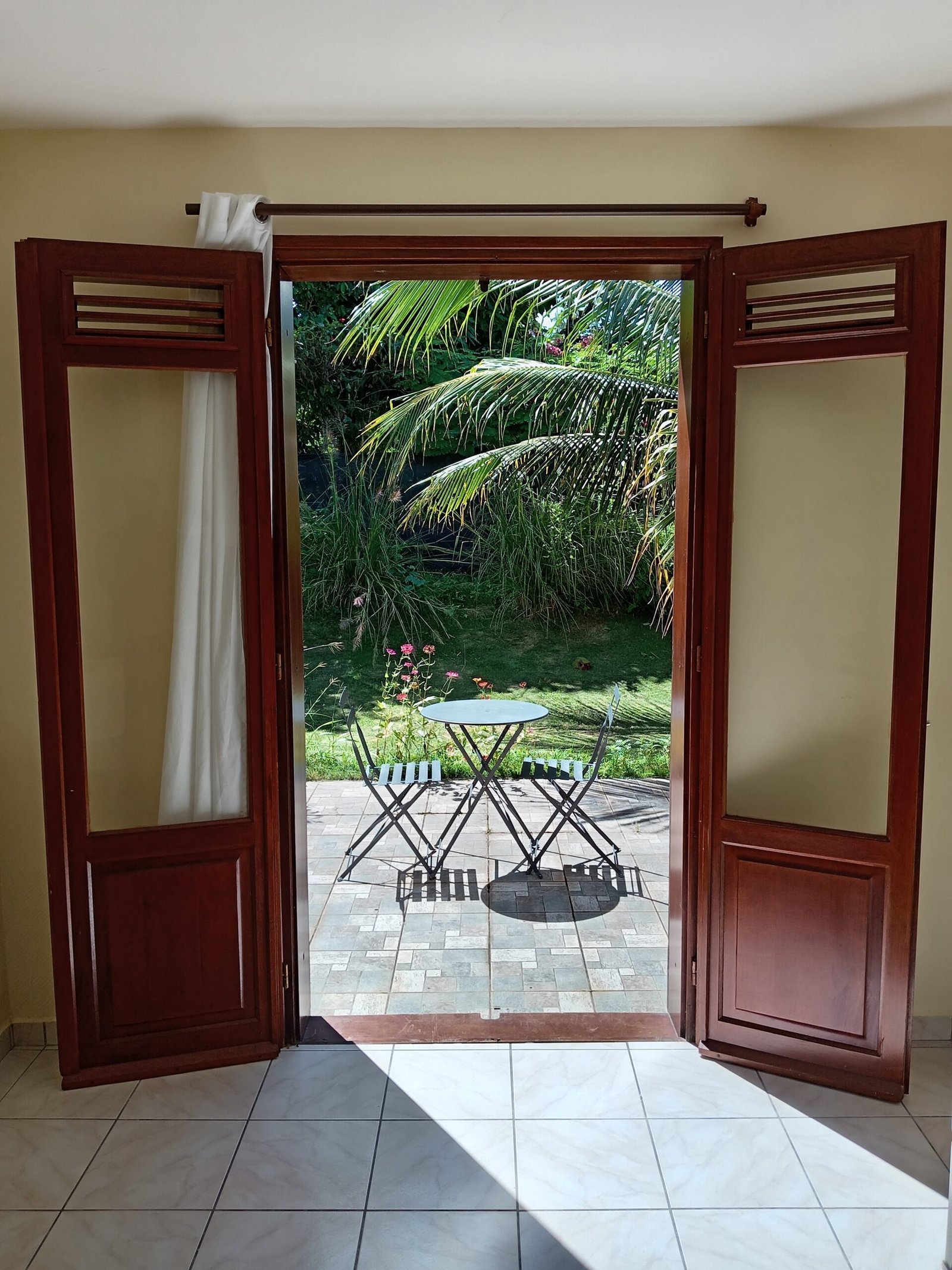 Une pièce lumineuse et paisible, avec ses grandes portes-fenêtres donnant sur le jardin tropical. Vous pourrez y savourer un moment de calme, entouré de verdure et du chant des oiseaux. Tout est pensé pour votre confort et pour que vous vous sentiez ici comme chez vous.